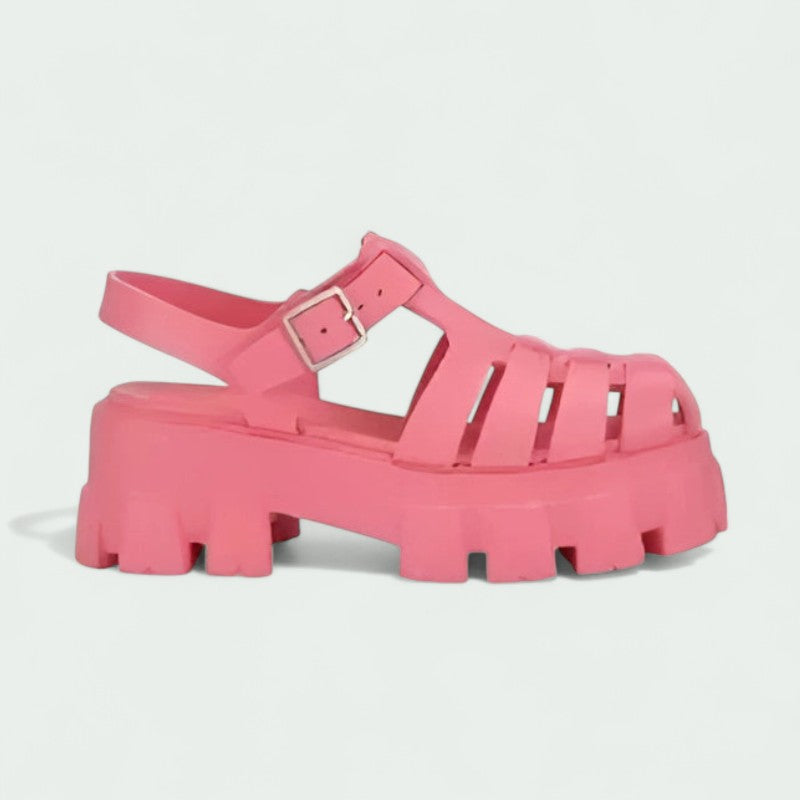 • Sole: Chunky platform sole for stability and added height • Fit: Adjustable buckle strap for a customizable fit • Design: Multiple straps for ventilation and secure hold